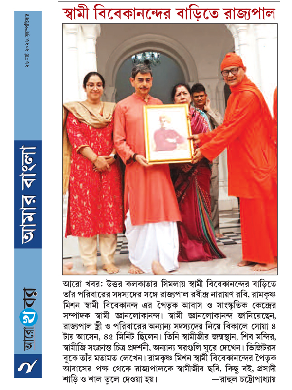 Honourable Governor of West Bengal R. N. Ravi has visited Ramakrishna Mission Swami Vivekananda's Ancestral House and Cultural Centre on 25th March 2026. He came with his family. He toured Swamiji's birthplace, the Shiva Temple, the exhibition of paintings related to Swamiji, and the other rooms within the premises. He also recorded his observations in the visitors' book. On behalf of the Ramakrishna Mission Swami Vivekananda's Ancestral House, the Governor was presented with a portrait of Swamiji, several books, a *Prasadi* saree, and a shawl.