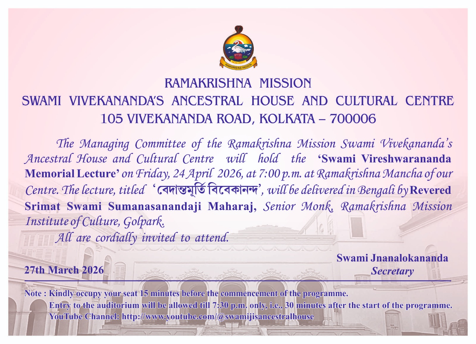 The Managing Committee of the Ramakrishna Mission Swami Vivekananda's Ancestral House and Cultural Centre will hold the 'Swami Vireshwarananda Memorial Lecture' on Friday, 24 April 2026, at 7:00p.m. at Ramakrishna Mancha of our Centre. The lecture, titled 'বেদান্তমূর্তি বিবেকানন্দ', will be delivered in Bengali by Revered Srimat Swami Sumanasanandaji Maharaj, Senior Monk, Ramakrishna Mission Institute of Culture, Golpark